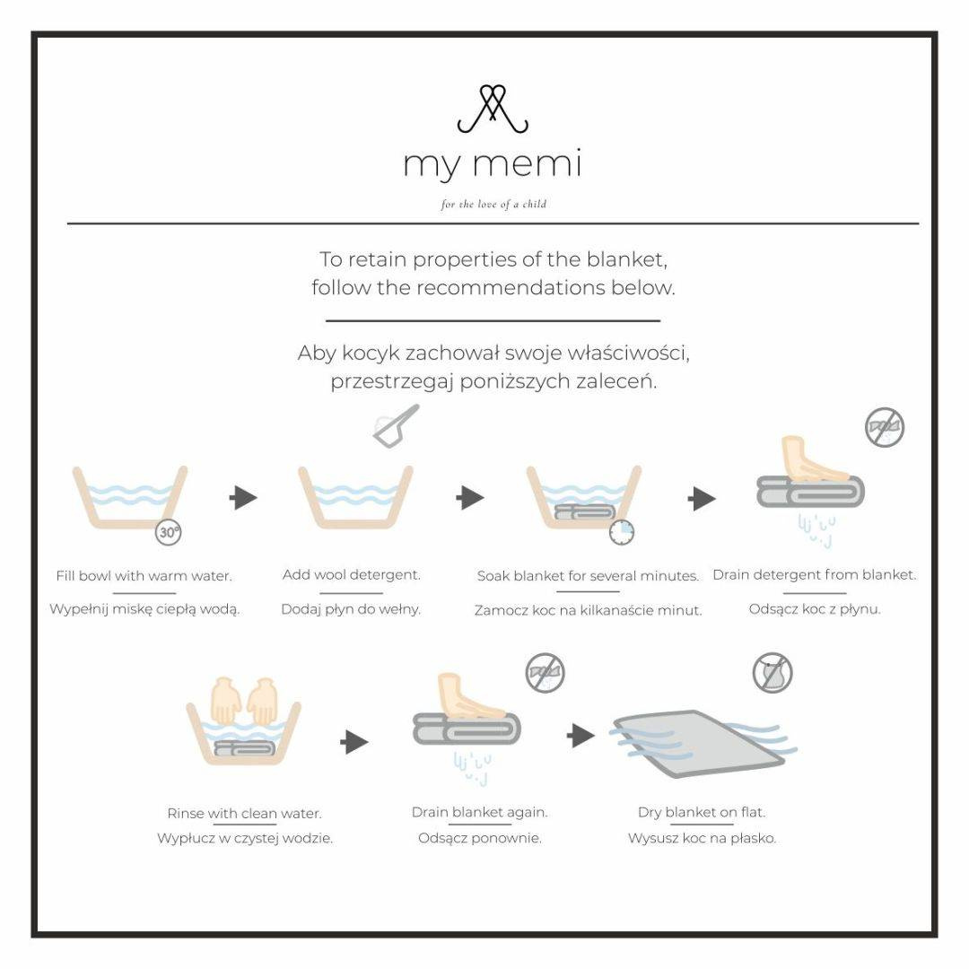Nasze kocyki są przystosowane do prania w pralce, jednakże tylko i wyłącznie na programie dedykowanym „wełna”. Nie jest to jednak rekomendowana przez nas forma prania, gdyż nie mamy możliwości sprawdzenia, czy zaprogramowane pranie wełny w Waszej pralce jest przystosowane do wymagań wełny merino, dlatego nie ponosimy odpowiedzialności za jej negatywne skutki (pranie w pralce na własne ryzyko).