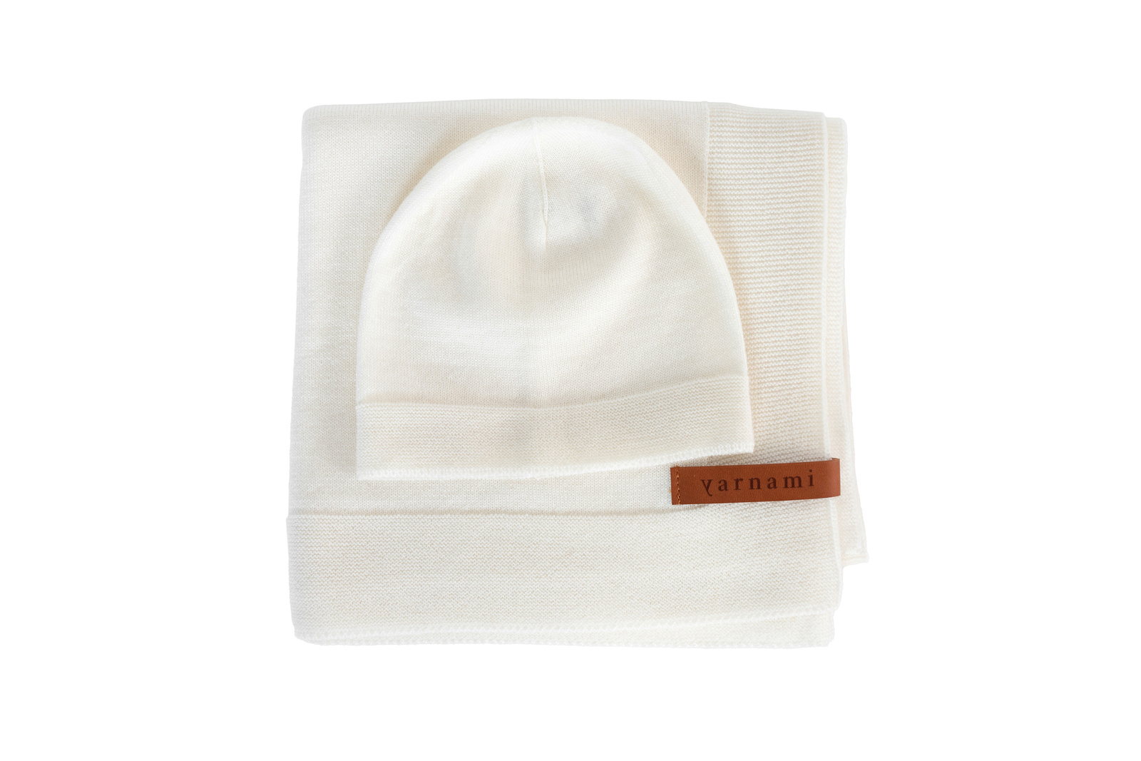 kocyk merino Cozy yarnami możesz kupić w zestawie z dopasowaną kolorystycznie czapeczką całoroczną.