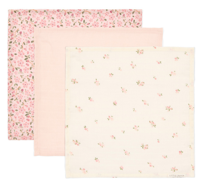 Chusteczki muślinowe 25x25 cm Fairy Garden od Little Dutch. Zestaw 3 chusteczek to prawdziwy wielofunkcyjny, wyprawkowy must-have! Wykonane w 100% z bawełny organicznej, mają praktyczne i wszechstronne zastosowania podczas karmienia maluszka, wycierania śliny lub rozlanych płynów. Chusteczki przydadzą się zarówno w domu, jak i w podróży. Ten zestaw 3 chusteczek łączy wzory z kolekcji Fairy Garden: Fairy Blossom i Fairy Floral z jednolitym różowym kolorem Blossom.