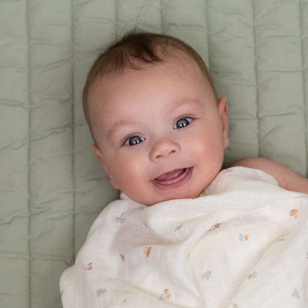 Otulacz muślinowy 120x120 cm Forest Treasures od Little Dutch. To prawdziwy wielofunkcyjny, wyprawkowy must-have! Otulacz wykonany w 100% z bawełny organicznej i posiada certyfikat Oeko-Tex – jest wyjątkowo miękki, chłonny i szybkoschnący. Idealny do osuszania dziecka po kąpieli, jako mata do przewijania lub ściereczka podczas karmienia. Otulacz jest ozdobiony uroczym wzorem Forest Treasures w grzybki, szyszki i żołędzie, które są motywami kolekcji Forest Friends.