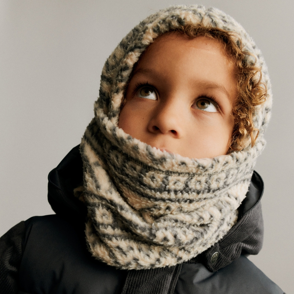 miękka i ciepła kominiarka z polaru z recyklingu, zaprojektowana tak, by zapewniać dziecku ochronę i komfort w chłodne, jesienno-zimowe dni. Gładka, przyjemna w dotyku dzianina otula głowę, uszy i szyję, skutecznie chroniąc przed wiatrem i mrozem podczas spacerów i zabaw na świeżym powietrzu. Elastyczne detale z tyłu gwarantują lepsze dopasowanie. Subtelny wzór żakardowy nadaje jej stylowego, dziecięcego charakteru.
