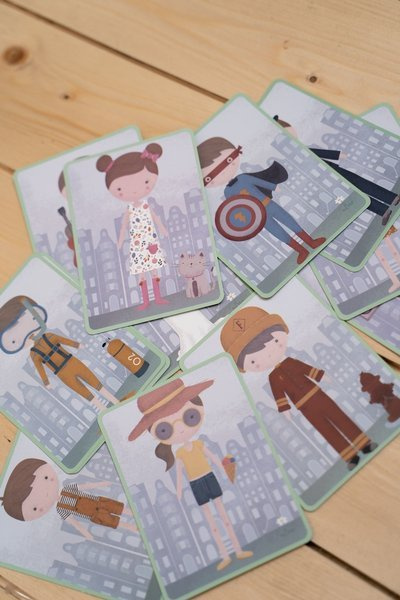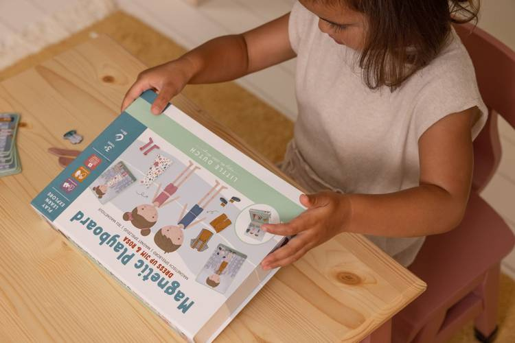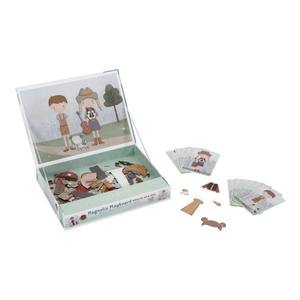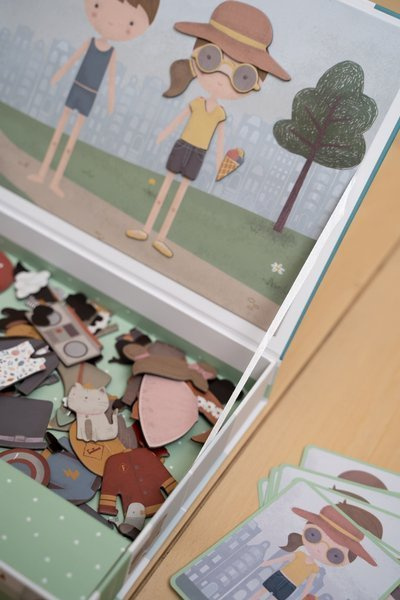 Zestaw magnesów Rosa & Jim od Little Dutch. Zestaw składa się z 80 małych magnesów, 6 kart dla Rosy i 6 dla Jima. Wewnątrz kartonu na wieczku znajduje się magnetyczna pokrywa do której dziecko przyczepia magnesy. Zabawa polega na ubieraniu postaci, kreowaniu otoczenia. Dwójkę ulubionych bohaterów, którymi są Rosa i Jim, znanymi dotąd jako lalki-przytulanki, możemy teraz dowolnie stylizować. Zabawa pobudza kreatywność. Pozwala również ćwiczyć prawidłowy chwyt małych rączek. Pudełko jest wykonane z wysokiej jakości kartonu, aby łatwo przechowywać wszystkie elementy. Świetny pomysł jako zabawa-gra w czasie podróży.