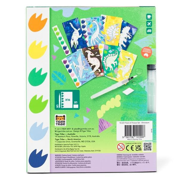 Przenośne Kolorowanki Wodne – Dinozaury od Tiger Tribe. Maluchy mogą odkrywać malowanie bez bałaganu dzięki temu przenośnemu zestawowi. Kolorowanka wodna to idealne wprowadzenie do malowania dla maluchów. Zestaw zawiera 16 pięknie ilustrowanych stron z motywem wesołych dinozaurów (z opisem każdego gatunku). Na każdej stronie znajduje się zestaw farbek z kolorami dopasowanymi do danego obrazka. Malowanie odbywa się z pomocą bezpiecznego i czystego pędzelka wodnego. Każde dzieło sztuki można wyrwać z zestawu i oprawić w ramki.