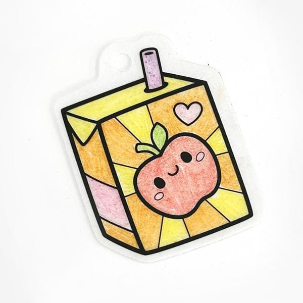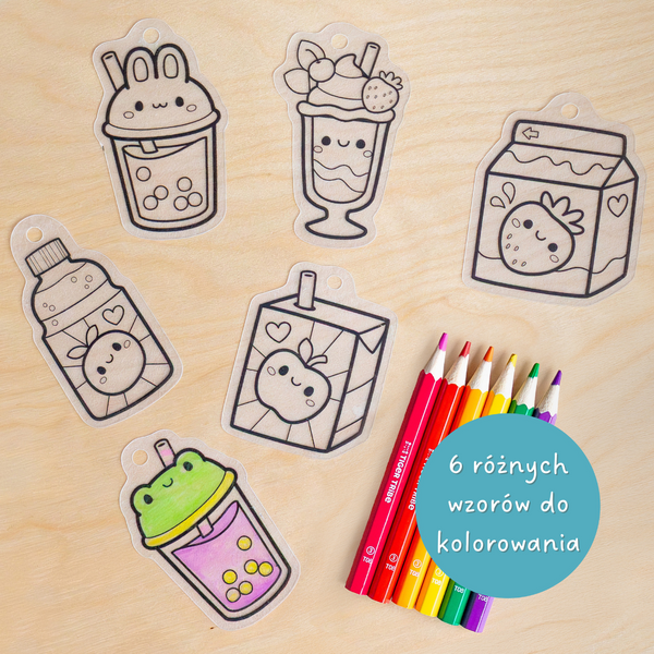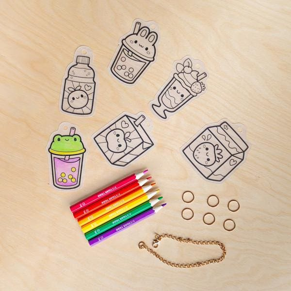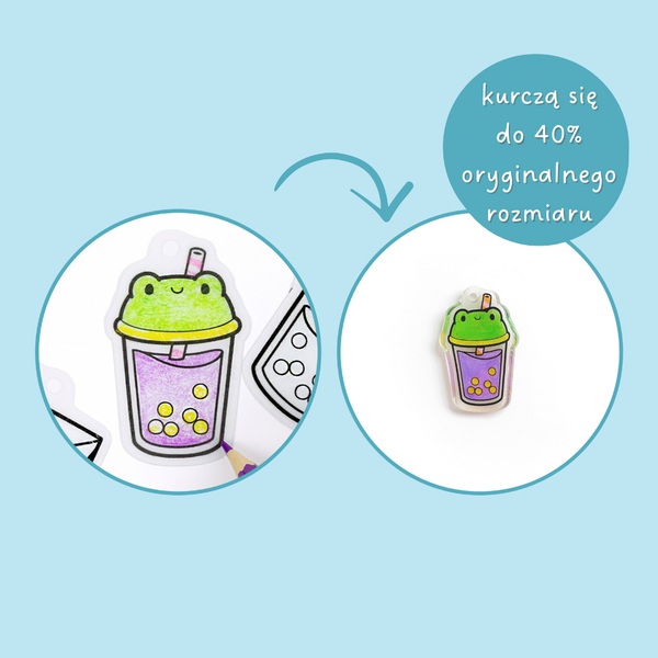 Ilustrowane, wstępnie wycięte elementy do pokolorowania, które kurczą się w piekarniku do 40% pierwotnego rozmiaru.