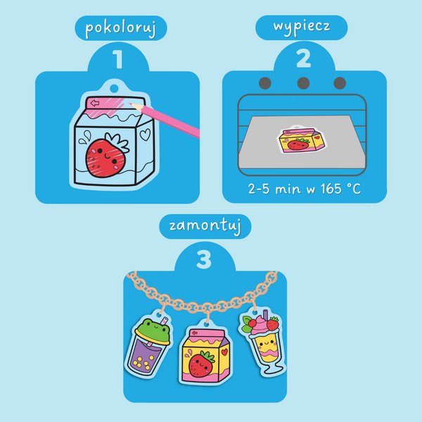 UWAGA! Konieczny jest nadzór osoby dorosłej. Wymagany jest konwencjonalny piekarnik. Nie używaj kuchenki mikrofalowej. Proces kurczenia się materiału nie jest częścią funkcji zabawki i powinien być przeprowadzany przez osobę dorosłą. Nie przekraczaj temperatury 165°C. Nie przekraczaj maksymalnego zalecanego czasu obróbki cieplnej. Nie podgrzewaj materiału jednocześnie z żywnością w domowym piekarniku.