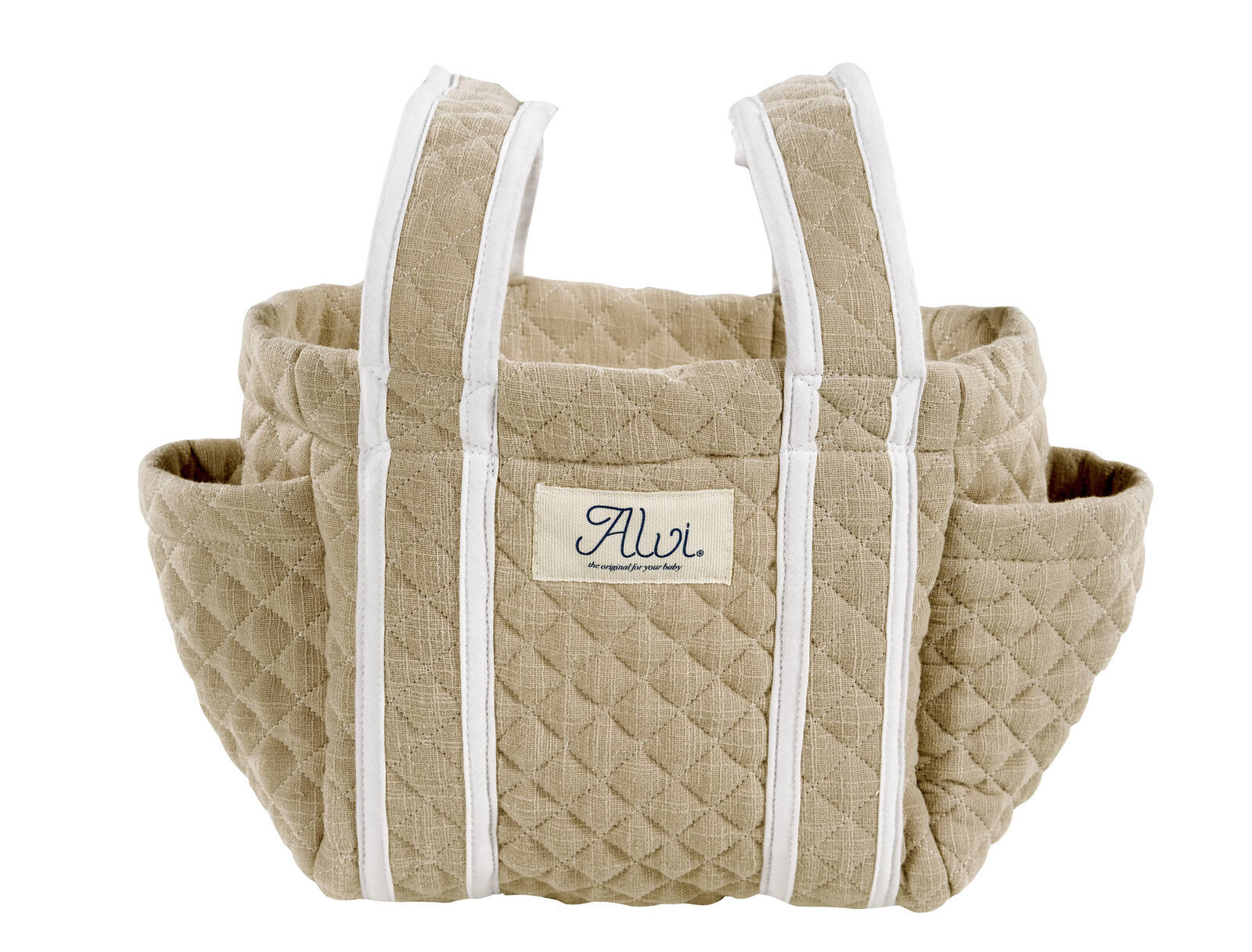 - Organizer do wózka Alvi z miękkiej bawełny, z rączkami zapinanymi na rzep, jest idealny do szybkiego mocowania i odpinania. Posiada dwie boczne kieszonki i otwartą formę, co pozwala na wygodne przenoszenie i użytkowanie także w domu, np. przy przewijaku.