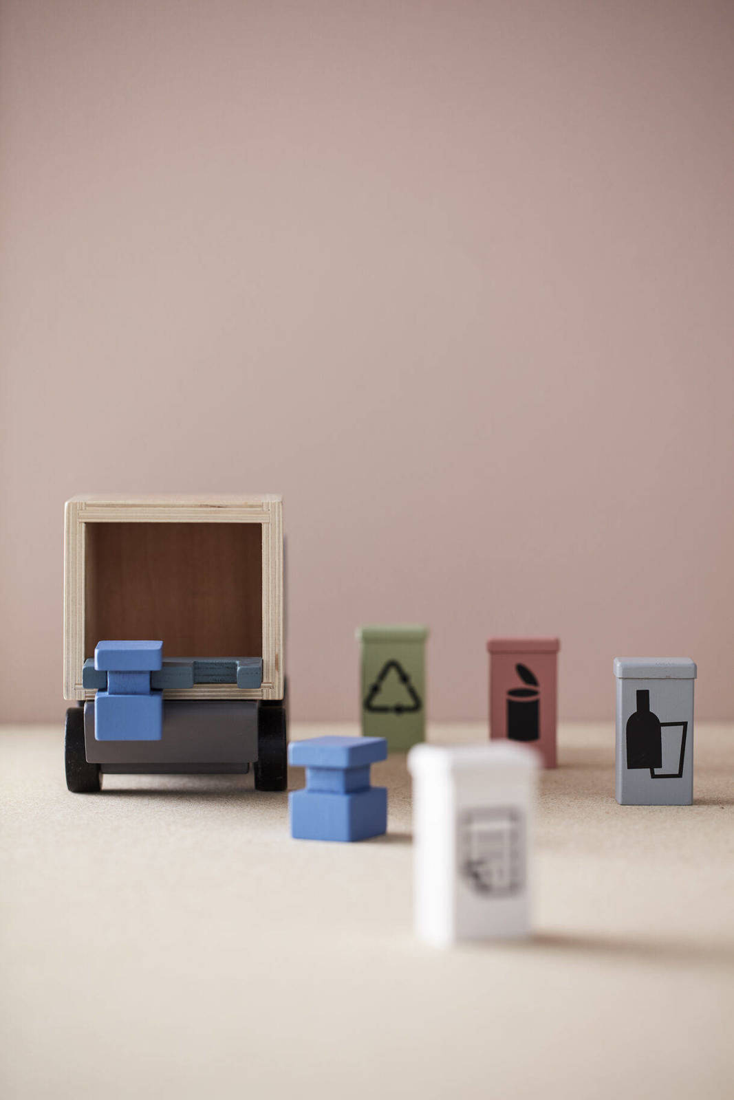 Czas na recykling! Drewniana ciężarówka na śmieci z czterema koszami sortującymi do recyklingu, zainspiruje malucha do kreatywnej zabawy. Pojemniki można umieścić na podnośniku z tyłu pojazdu. Każdy z pojemników inny symbol: papieru, szkła i metalu. Kształt i kolory sprawią, że zabawa nim będzie jednocześnie rozwijać u dziecka zdolności motoryczne, koordynację wzrokowo-ruchową oraz wyobraźnie, tworząc podczas zabawy ciekawe historie. Ciężarówka. Doskonale sprawdzi się również w roli prezentu. Produkt zgodny z aktualnymi standardami bezpieczeństwa UE.