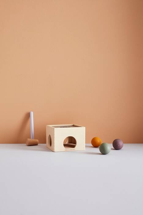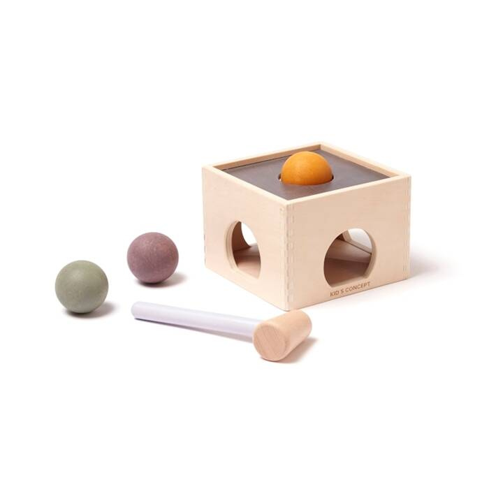 Umieść drewnianą kulę na górze pudełka i uderz ją młotkiem, aby wpadła do środka. Nigdy nie wiadomo, z której strony wypadnie piłka. Są aż 4 możliwości! Drewniana wbijanka gwarantuje mnóstwo radości każdemu dziecku jednocześnie ucząc koncentracji oraz koordynacji oko-ręka.