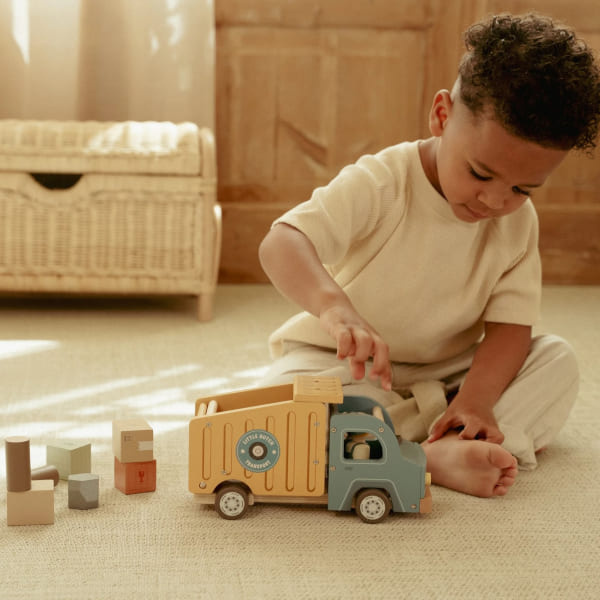 Czas na rozładunek! Ta drewniana wywrotka ma ruchomą platformę oraz otwieraną tylną klapę.  Przewozi różne ładunki, takie jak kłody, kamienie i drewniane skrzynki. Wjedź na plac budowy, przechyl platformę i zrzuć ładunek. Ta drewniana wywrotka idealnie pasuje do innych pojazdów budowlanych. W kabinie znajdziemy kierowcę i pomocnika.