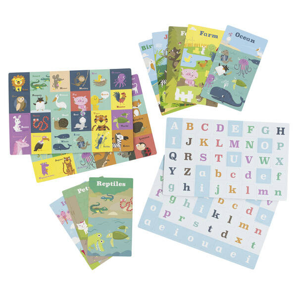Skład zestawu: 80 magnesów z literami (wielkie i małe litery), 48 magnesów z obrazkami, 8 ilustrowanych kart