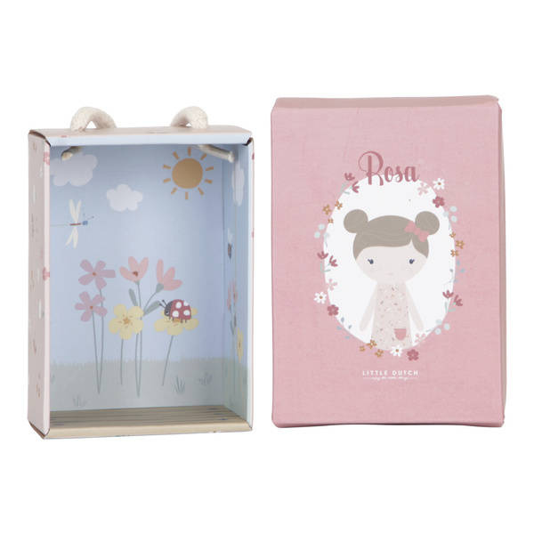 Laleczka Rosa 10 cm od Little Dutch to urocza, malutka przytulanka, wykonana z miłego i miękkiego materiału. Będzie wspaniałą towarzyszką wszystkich zabaw, a dzięki niewielkim rozmiarom można mieć ją zawsze przy sobie. Wyglądem przypomina prawdziwą dziewczynkę. Laleczka ma na sobie różową sukienkę z kwiatowym wzorem, wysokie buciki z pomponami i kokardę de włosach. Można ją posadzić. Laleczka zapakowana jest w piękne, kartonowe pudełeczko ze sznureczkiem - dlatego idealnie nadaje się na prezent. Do kompletu można dokupić również lalkę Rosa w rozmiarze 35 lub 50cm. Będzie stanowić świetne uzupełnienie do pozostałych zabawek z kolekcji Little Pink Flowers.