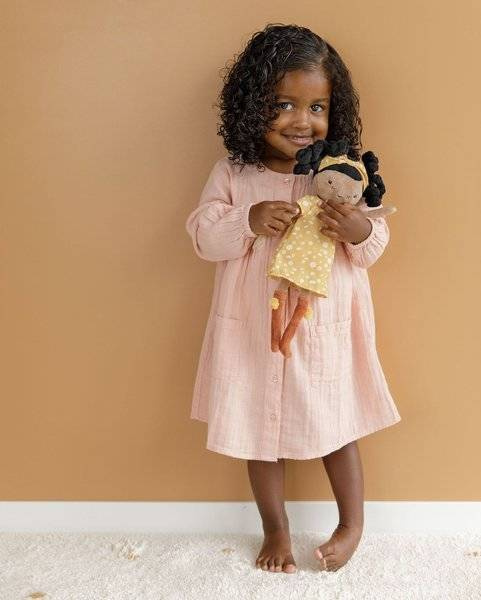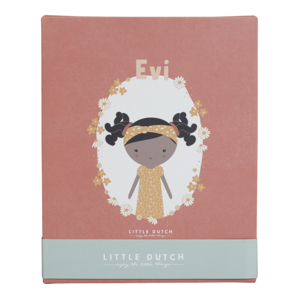 Urocza i przytulna lalka Evi wykonana z miłego i miękkiego materiału. Będzie wspaniałą towarzyszką dziecięcych zabaw i ukochaną przytulanką. Wyglądem przypomina prawdziwą dziewczynkę. Evi ma ciemne, kręcone włosy z opaską, piękną, żółtą sukieneczkę. Można ją posadzić. Zapakowana w piękne, kartonowe pudełeczko, które może być jej domkiem. Idealny pomysł na prezent.
