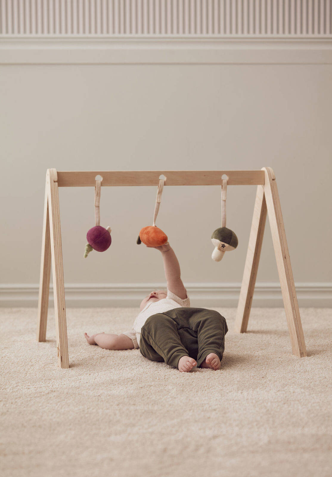 Klasyczny drewniany pałąk na zabawki w nowej innowacyjnej formie. Pałąk solidnie wykonany ze stabilnej drewnianej ramy, postawiony nad niemowlakiem nie przewraca się i jest bezpieczny dla dziecka. Posiada trzy otowry do powieszenia uroczych, miłych w dotyku zawieszek z kolekcji Aiden lub Edvin (do kupienia osobno). Kształt zawieszek oraz zapięcia na delikatny rzep ułatwią umieszczenie ich do drewnianego pałąka. Możliwość wykorzystania aktywnego pałąka na macie edukacyjnej.
