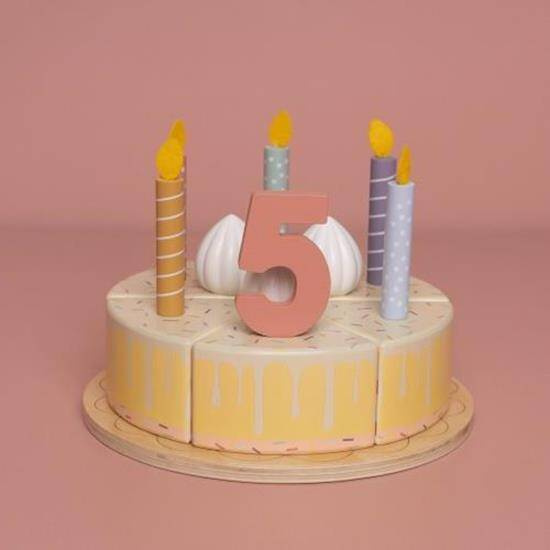 - Urodzinowy torcik drewniany od Little Dutch malowany bezpiecznymi farbami dla dzieci. W skład tortu wchodzą: 6 kawałków tortu, 5 świeczek, 3 kuleczki bitej śmietany, 3 dekoracje w kształcie słodkości, 2 zwierzątka, łopatka do nakładania, cyferki.