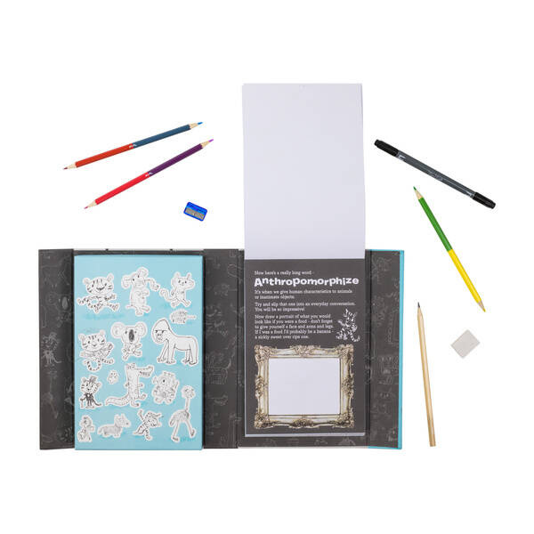 Skład zestawu: 50-stronicowy szkicownik z ćwiczeniami, 1x dwustronny cienkopis (0,4 mm i 1,2 mm), 1x ołówek artystyczny 2B, 3 x dwustronne kredki kolorowe (6 kolorów), gumka i temperówka, magnetyczne pudełko do przechowywania