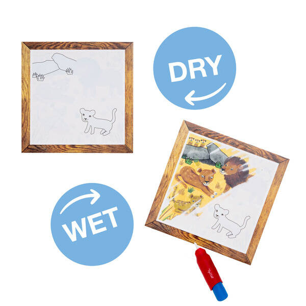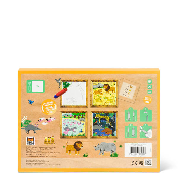 Kolorowanka Wodna - Safari od Tiger Tribe. Maluchy mogą odkrywać malowanie bez bałaganu dzięki temu przenośnemu zestawowi. Kolorowanka wodna to idealne wprowadzenie do malowania dla maluchów. Ukryte obrazki można odkryć przy użyciu samej wody za pomocą grubego pędzla wodnego o idealnym rozmiarze dla małych rączek. Po wyschnięciu sceny znikają, dzięki czemu dzieci mogą bawić się w kółko! Do odkrycia są 4 obrazki z motywami zwierzątek na safari. Z tyłu każdego obrazka są zadania - na każdej planszy z ilustracjami należy odszukać i policzyć podczas malowania określone elementy. Gwarantuje to wiele godzin zabawy!