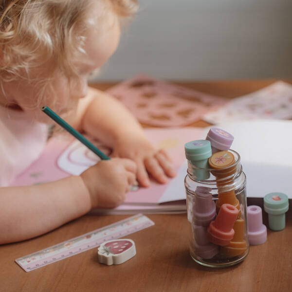 Zestaw pieczątek Fairy Garden od Little Dutch pozwoli Twojemu maluchowi stworzyć własny wspaniały bajkowy ogród. Zestaw zawiera 16 różnych pieczątek, w tym uroczą sarenkę, wiewiórkę i biedronkę, a także truskawkę, kwiaty, grzyby i pszczołę. Pieczątki są już z tuszem – od razu można z nich korzystać. Poprzez przyjemną zabawę stymulują kreatywność dzieci przy jednoczesnym rozwijaniu ich umiejętności motorycznych.