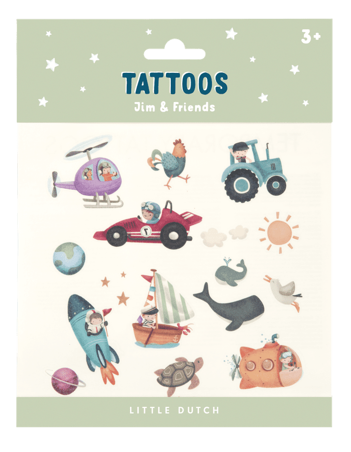 Tatuaże Jim & friends od Little Dutch. Te urocze tatuaże wywołają uśmiech na twarzy każdego dziecka! Zestaw zawiera tymczasowe tatuaże z motywami Waszych ulubionych kolekcji od Little Dutch z ich uroczymi bohaterami oraz uroczym Jimem. Idealnie sprawdzą się jako zabawny dodatek na przyjęcie dla dzieci lub urodziny. Tatuaże są odpowiednie dla dzieci w wieku od 3 lat i są bezpieczne dla skóry dzieci. Łatwa aplikacja i zmywanie. Ten produkt świetnie sprawdzi się jako drobny upominek.