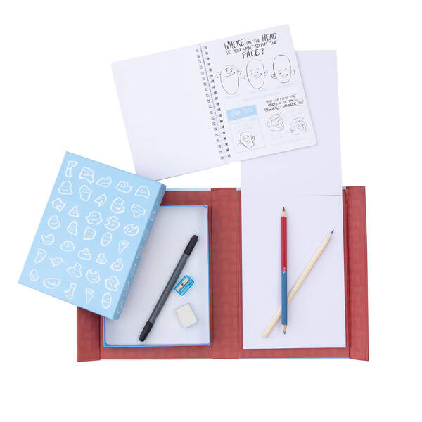 Skład zestawu: 24-stronicowy przewodnik po rysowaniu, 40-stronicowy notatnik z papieru artystycznego, 1x dwustronny cienkopis (0,4 mm i 1,2 mm), 1x ołówek HB z szarym grafitem, 1x dwustronny ołówek niebieski i czerwony, gumka i temperówka, magnetyczne pudełko do przechowywania